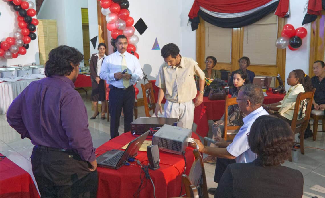 Above: Adam Montserrin, at centre with microphone, with iGovTT connect technical staff consider the adamantly uncooperative projector at the launch of TTConnect On September 09, 2007. Photo by Mark Lyndersay.