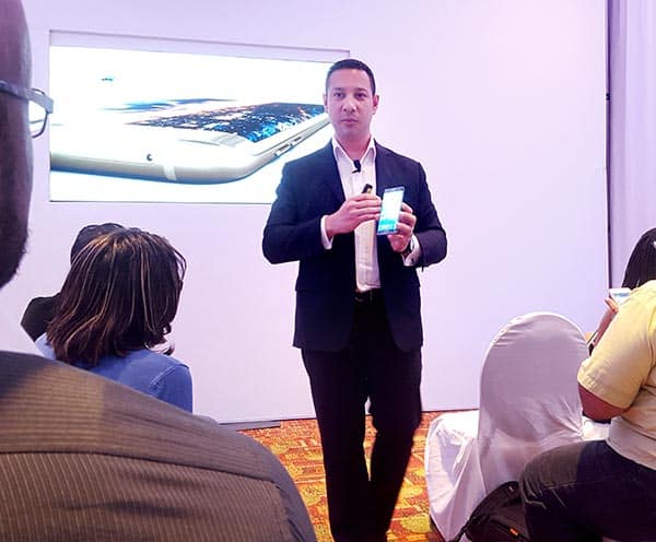 Above: Jorge Lopez rather fashionably explains the features of the new Samsung large screen phones at the company’s September 17 launch in T&T. Photo by Mark Lyndersay