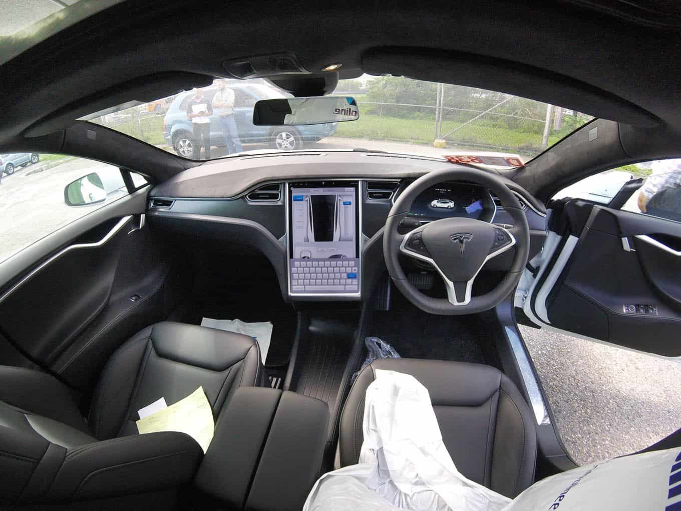Above: The interior of the freshly unwrapped Tesla Model S on the port. Photograph by Ian Smart, courtesy Smart Energy.