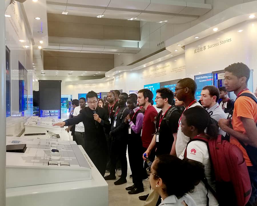 Above: At Huawei campus in Shenzhen, ICT Students from Zimbabwe, France and T&T learn about new technologies in Huawei Carrier, Enterprise and Consumer Business at the Exhibition Halls. Photo courtesy Huawei.