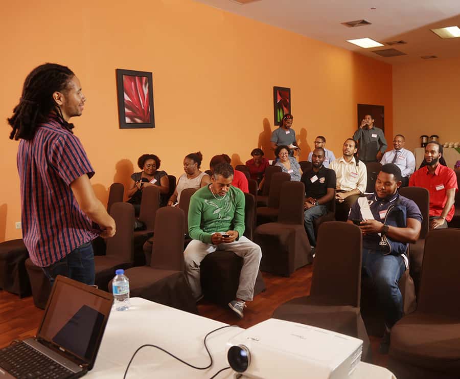 Above: Imanuel Gittens speaks to bloggers and developers at the first WP meetup. Photo courtesy WebGold.