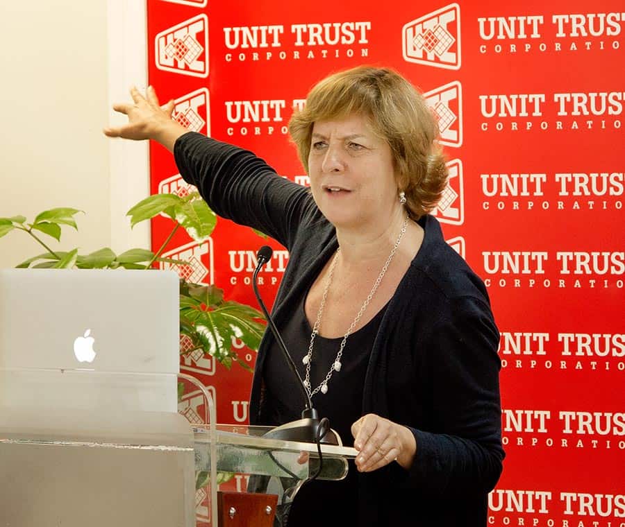 Above: Vivian Schiller, a veteran of CNN, Discovery Channel, the New York Times, NPR, NBC and Twitter speaking on the rise of digital media at a business luncheon for media hosted by the Unit Trust last week. Photo by Mark Lyndersay.