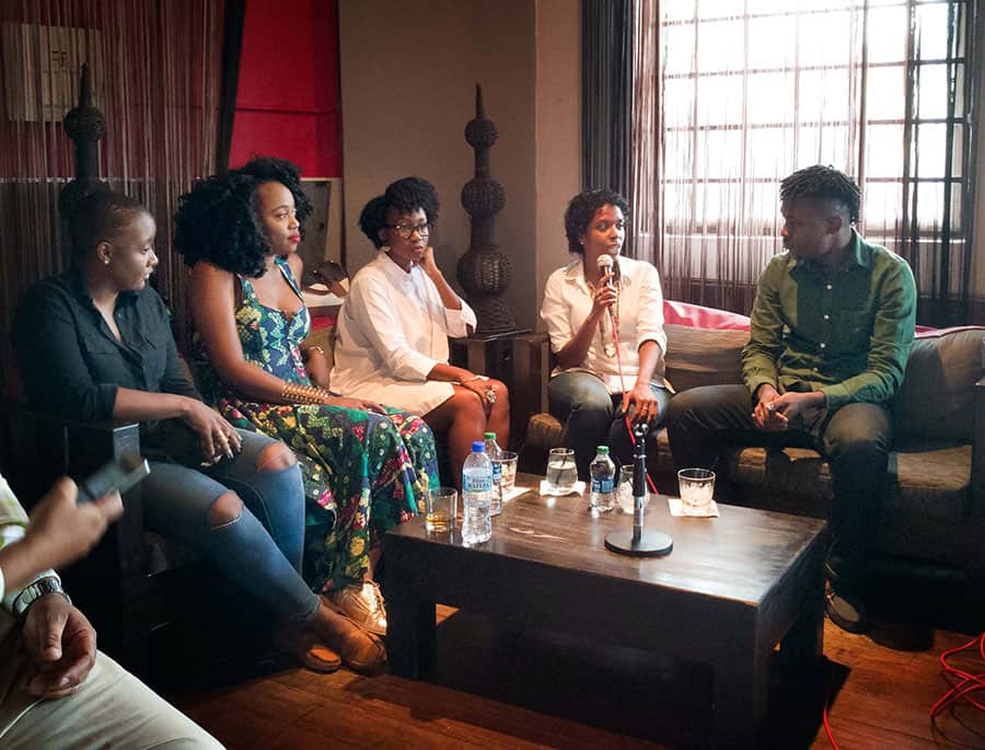 Cheyenne Baptiste (left) and organiser Mel Gabriel look on as Dale Lutchman takes the microphone from moderator Ardene Sirjoo during the discussion on influencer marketing at the T&T leg of the Caribbean Bloggers Meetup. Photo by Mark Lyndersay.