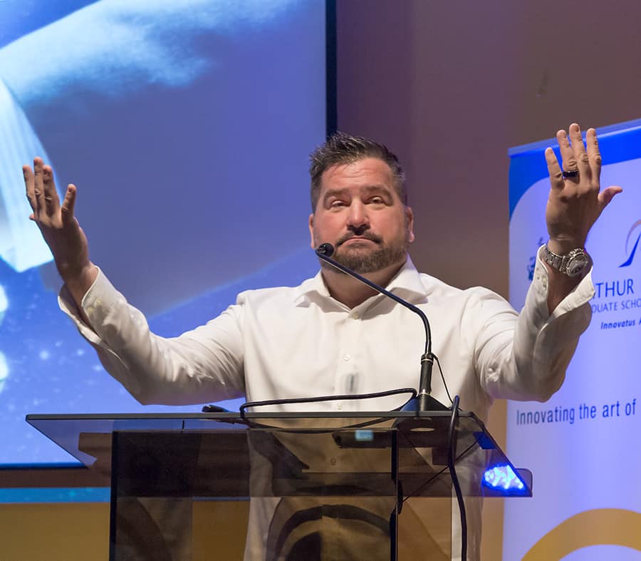 Above: Highlight speaker Calvin Bryant gets religious at the IT Expo 2017. Photo by Mark Lyndersay.