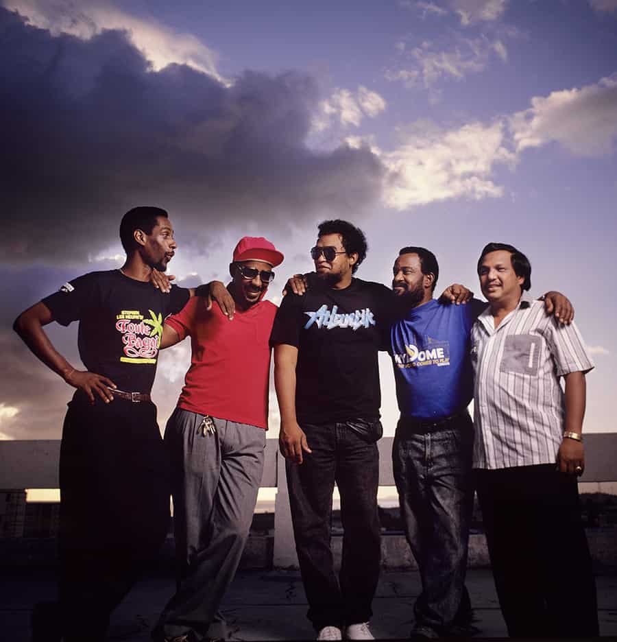 Brian Ng Fatt, who would go on to be a Chief Photographer of the paper, corralled the five biggest soca bandleaders, from left, Carl “Beaver” Henderson (Fire Flight), Mose Lewis (Sound Revolution),Andy Joseph (Atlantik), Pelham Goddard (Charlie’s Roots) and Bobby Quan (Blue Ventures) for a photo on the Guardian’s rooftop in early 1991. Photo by Mark Lyndersay.