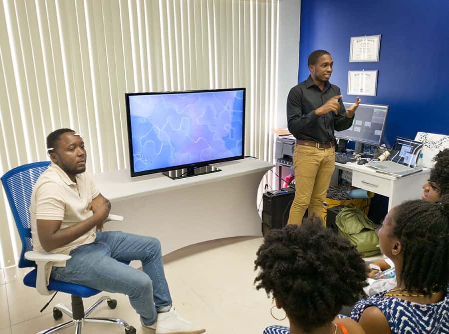 Above: Kheston Walkins, right, demonstrates the output from the EEG device. Photo by Mark Lyndersay.