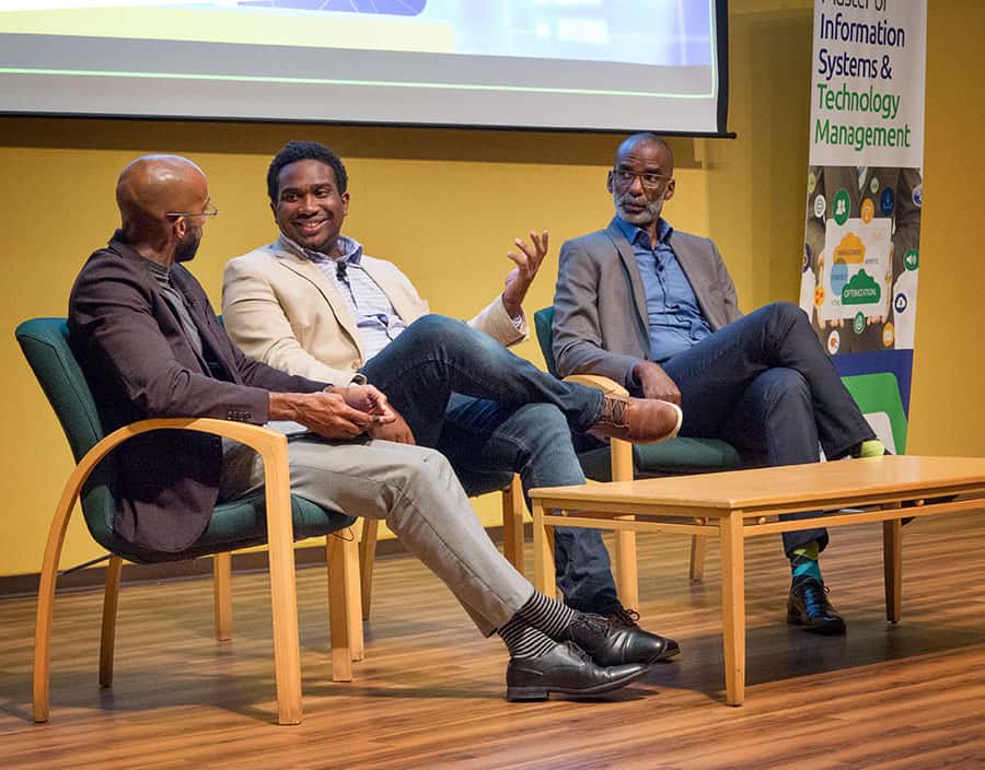 Above: Lorenzo Hodges, moderator, Aldwyn Wayne and Ian Alleyne answering questions at the Graduate Business School. Photo by Mark Lyndersay.