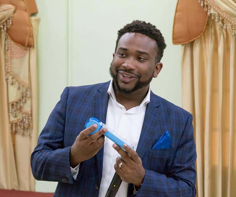 Above: Aldwyn Wayne demonstrates the WiPay terminal on Tuesday. Photographs by Mark Lyndersay.