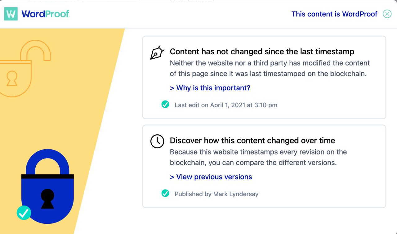 If I decide to take legal action on any site, I’ve taken one pre-emptive first step by adding WordProof to the website.