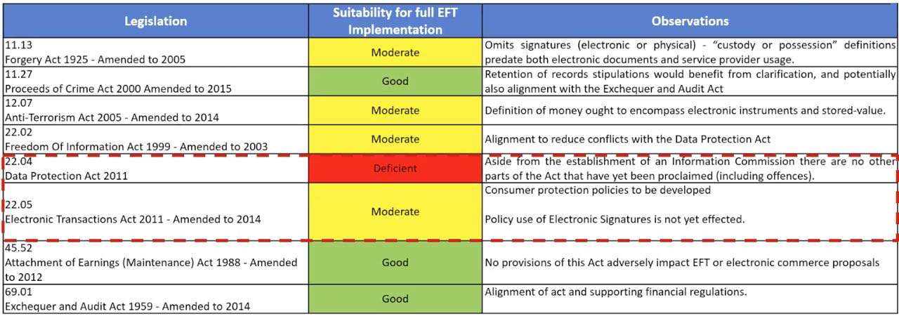 These include, updating the Electronic Transaction Act, 2011, updating the Data Protection Act, fully implementing the E-Money Issuer order 2020, the Cybercrime Bill, and simplifying due diligence for AML/CFT 2021.