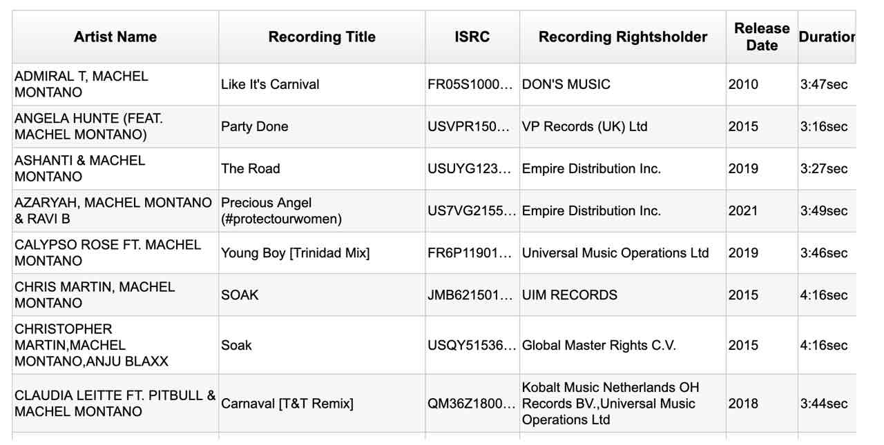A search using a tool provided by the PPL music licensing agency in the UK turns up 105 songs attributed to Machel Montano of which seven have no ISRC data.