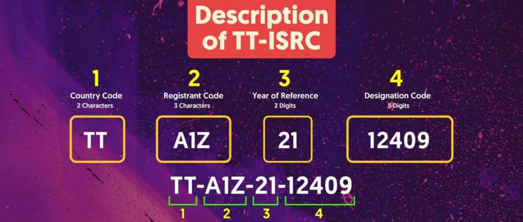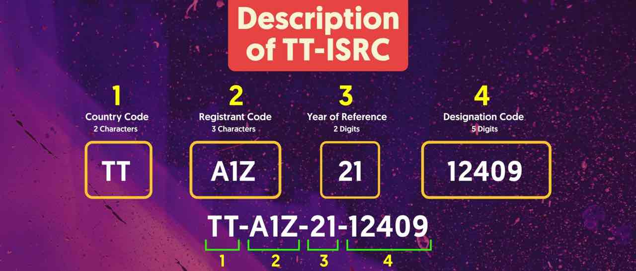 An ISRC is a unique 12-digit number comprised of a country abbreviation (TT), a three-digit registrant code, a two-digit year code and a file-specific designation code.