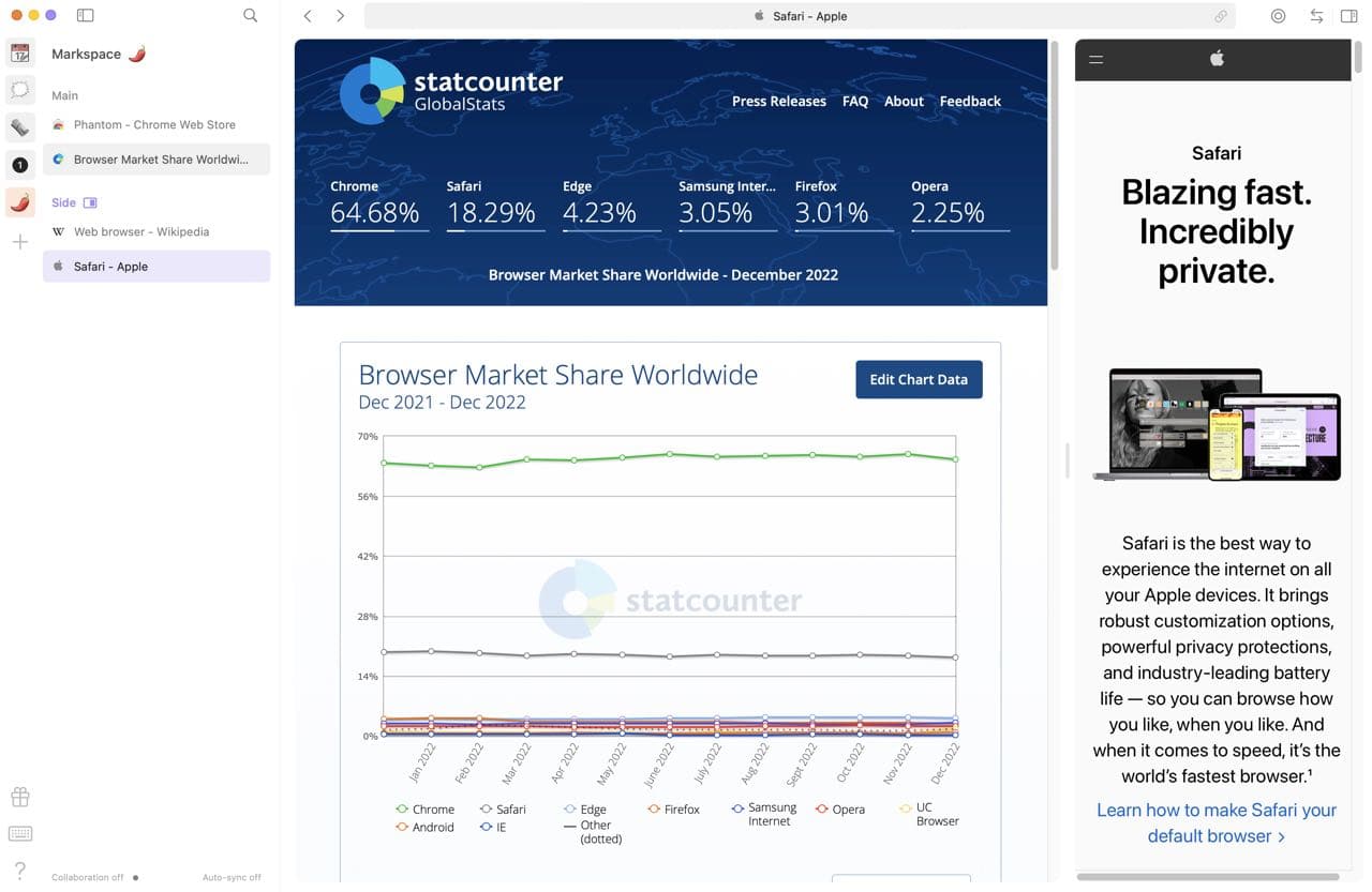 SigmaOS also has a sidebar and split-view but both are more confusingly implemented. The sidebar on SigmaOS only rewards users that work extensively with the web apps you can park there and the split-screen option is more of a sidebar than a useable space