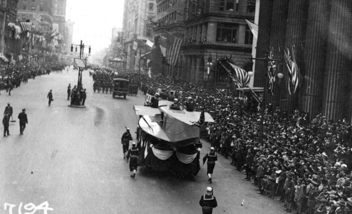 Above: A Naval Aircraft Factory float, featuring the hull of a F5L patrol seaplane, going south on Broad Street, escorted by sailors with rifles. Photo: US Naval History and Heritage Command,
