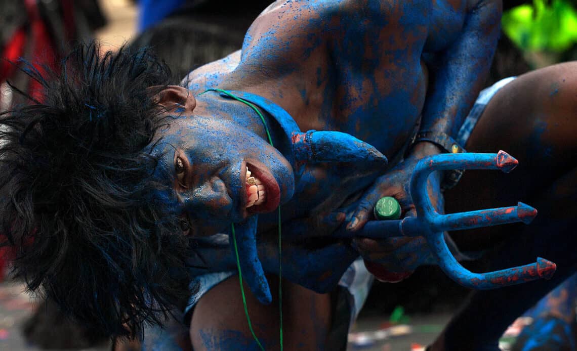 Above: A blue devil performing at the Socadrome in 2017. Photo by Mark Lyndersay.