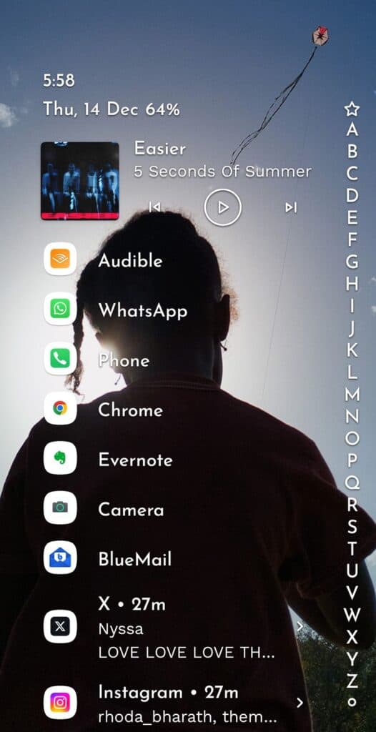 If you include a media player and the date and time, you can fit nine to ten apps in the list. There’s a convenient alphabetical key on the right that you can use to jump to software that’s not in your primary list.