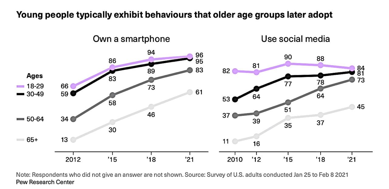 A Pew Research Center study found that the news appetites that are prevalent among younger age groups are increasingly adopted by their seniors.