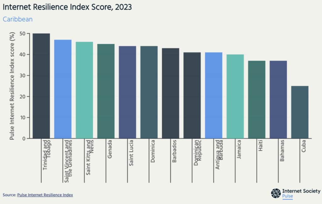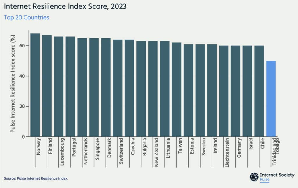 TT has an overall internet resilience score of 50 per cent, the highest for the region. ISOC describes this as a medium capacity to withstand unexpected faults in the normal operation of its telecommunications data network.