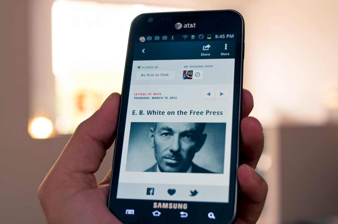 Above: Flud, running here on Android, is one of a new breed of user-friendly newsreaders that put popular bloggers on an equal footing with traditional media for the news consumer’s attention. Image courtesy Flud.