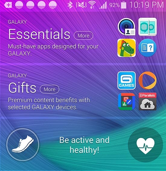 In lieu of a host of pre-installed apps, two widgets, Galaxy Gifts and Galaxy Essentials point to useful benefits and optional software that users can choose to install.