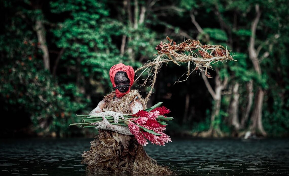 Some costumes are just leaves, others are cut leaves stuck on fabric. It’s a deep design study in the material; we all know fig trees and how they look like someone standing outside in the dark. You can use any other plant material too. Masqueraders have to make contact with us to figure out how to commemorate their loss, the thing they’re mourning.