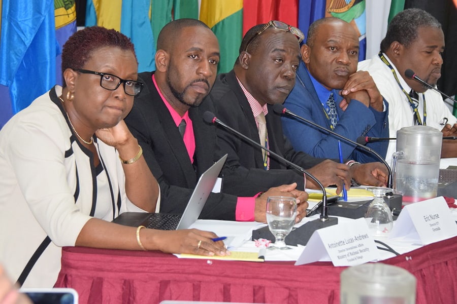 Above: Government agency representatives share their nations’ experiences having participated in Commonwealth Secretariat’s needs assessment exercises. Left to right; Antoinette Lucas-Andrews (Trinidad & Tobago), Eric Nurse (Grenada), Bennett Thomas (Dominica), Clifford A Bostic (Barbados) and Luxmore Edwards (Antigua and Barbuda). Photo courtesy the Caribbean Telecommunications Union