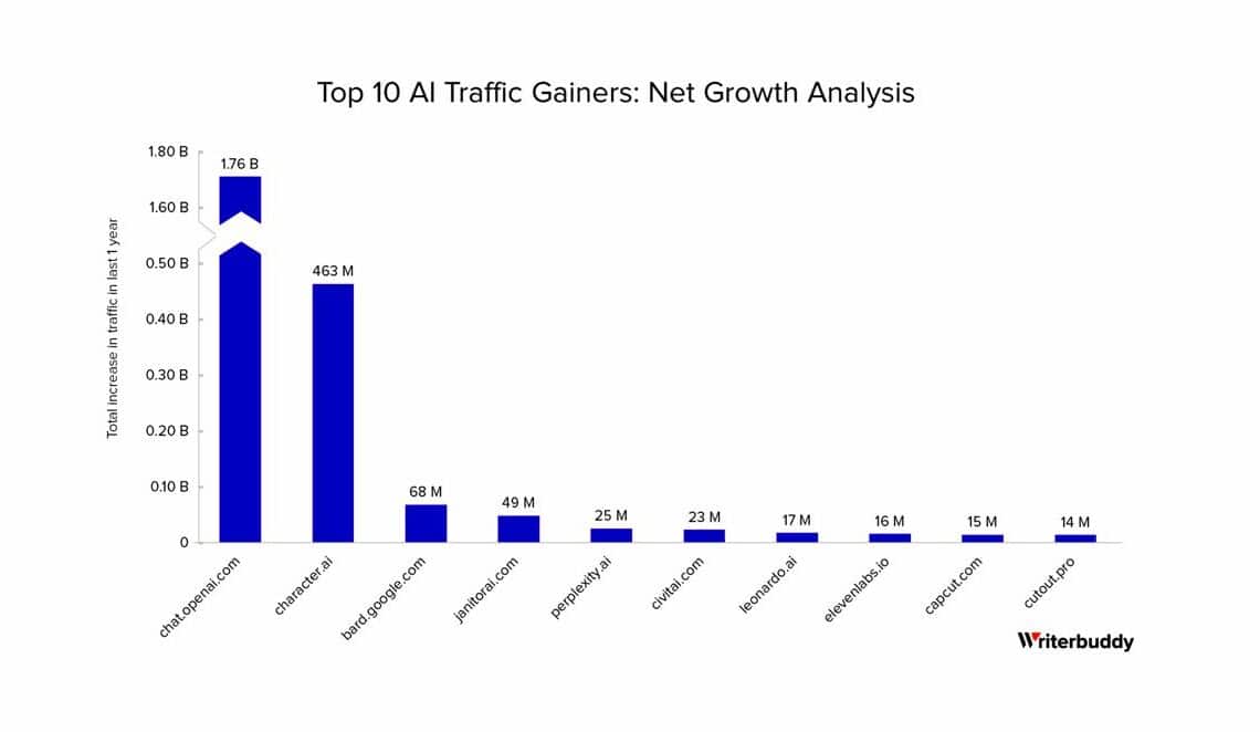 2. Character AI: Introduced in September 2022, it captivated users, accumulating 3.8 billion visits and surging by 463.4 million within a year.