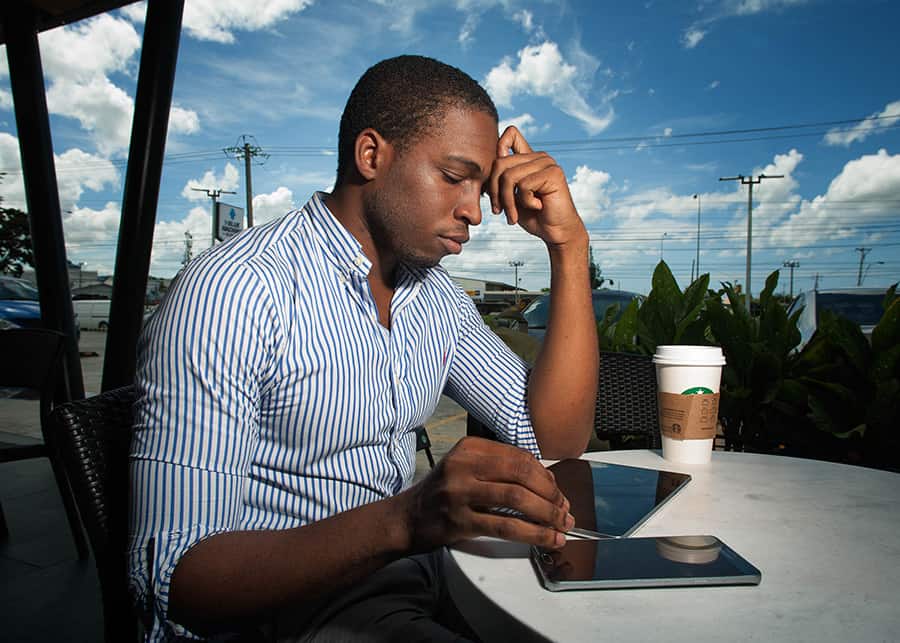 Above: Kheston Walkins considers his Communicare software. Photo by Mark Lyndersay. Click to enlarge images.