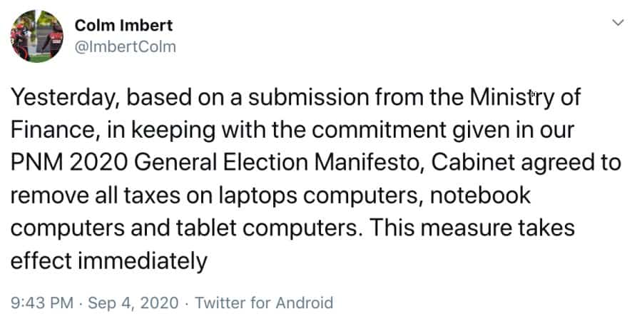 Colm Imbert announced on Friday night via Twitter that the Government would “remove all taxes on laptops, computers, notebook computers and tablet computers.”