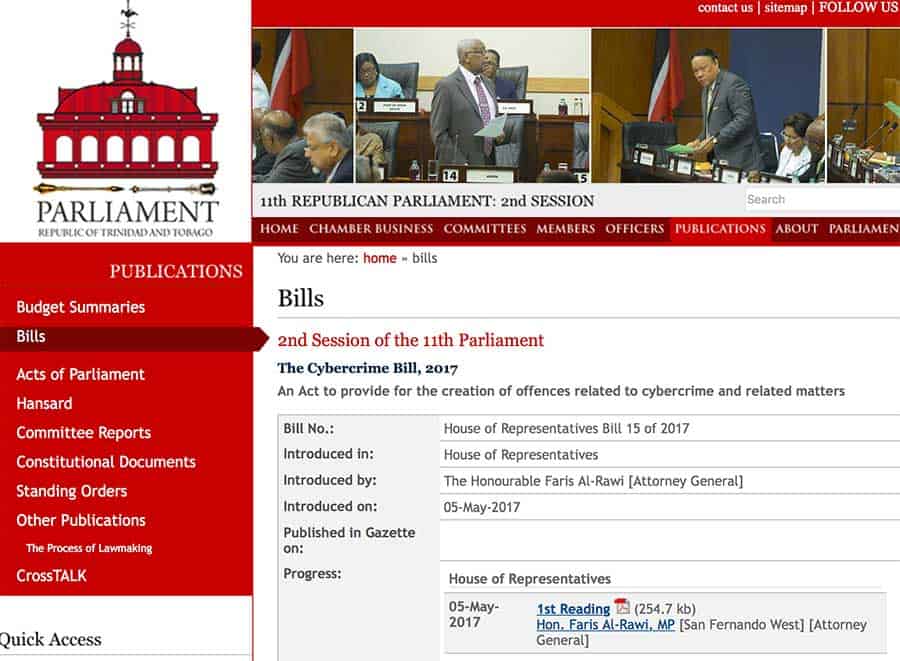 The Cybercrime Bill, 2017 was read by Attorney General Faris al Rawi on Friday 05 May, 2017 during the second session of the 11th Parliament as House of Representatives Bill 15 of 2017