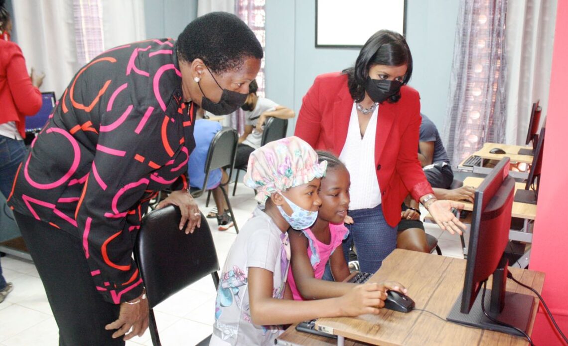 Above: Minister of Planning and Member of Parliament Arima, The Honourable Pennelope Beckles and Chair of Digicel Foundation- Desha Clifford guide two children from the La Fillette community with the use of the computer. Photo courtesy Digicel.
