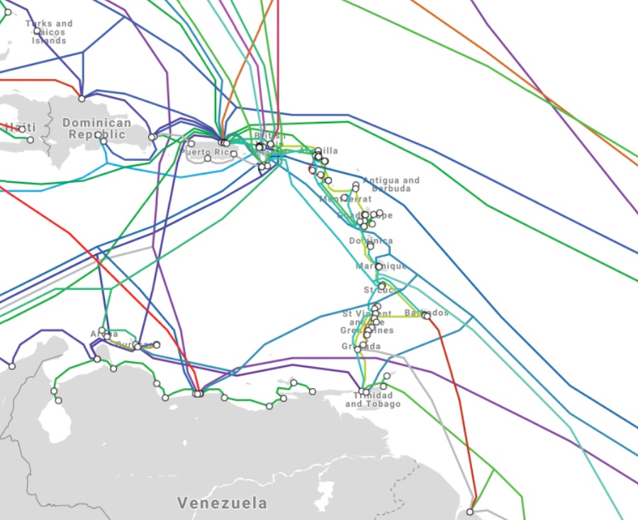 Above: Undersea cable connections charted by the Submarine Cable Map service. The purple line between Curacao and Trinidad was the point of failure.