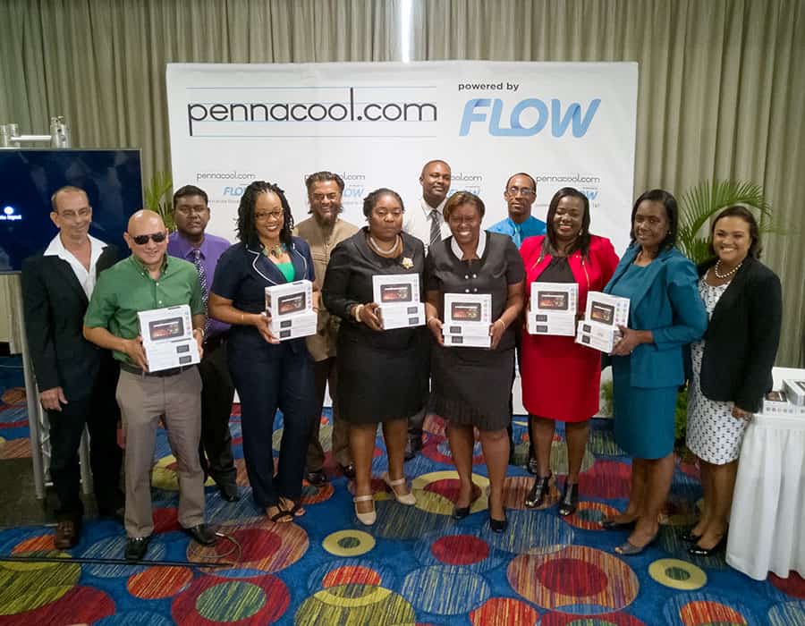Above: John Devaux, left, and Cindy-Ann Gatt, right, with representatives of the ten schools who have joined the Flow-Pennacool ICT programme. All photos by Mark Lyndersay. Click on any image to enlarge.