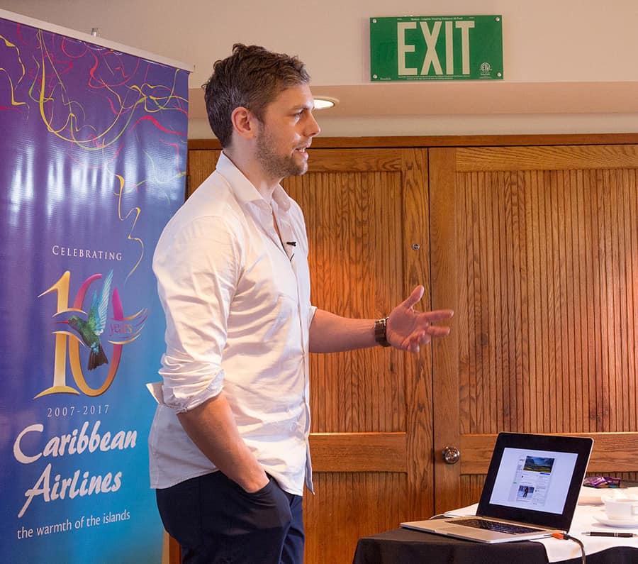 Above: Conner Galway leads a discussion on social media opportunities at the Kapok Hotel. Photo by Mark Lyndersay.