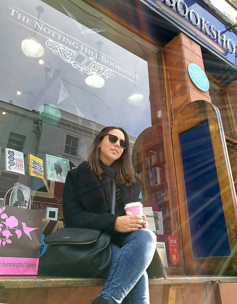 Above: Katy Esquivel strikes a pose at the landmark Notting Hill Bookshop in London, a crucial pitstop for the incurably romantic. Photo by Mark Lyndersay.