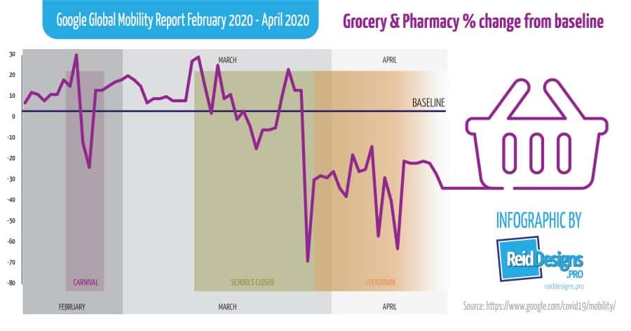 In this case what was very interesting to me, was the huge spike in “Park visits” during the Carnival season. This would probably be the last time we would see a spike like this for a long time to come. Also interesting the drop in “workplace” visits for the same period. Then there is the panic buying on the 30th of March when the lockdown was announced.