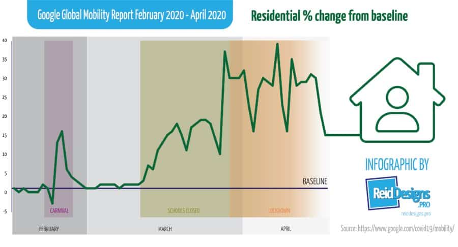 Above: Residential presence in T&T according to Google’s Mobility Tracker. Graphing and design by Ian Reid.