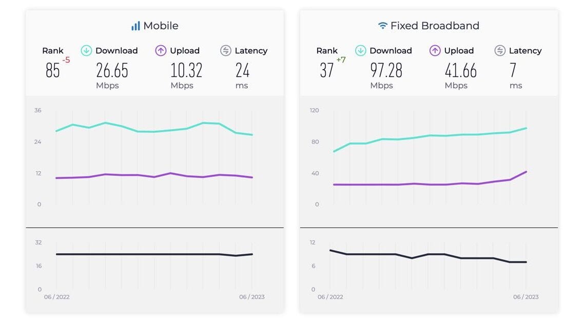 Above: Median broadband speeds logged by Ookla for Trinidad and Tobago in June 2023