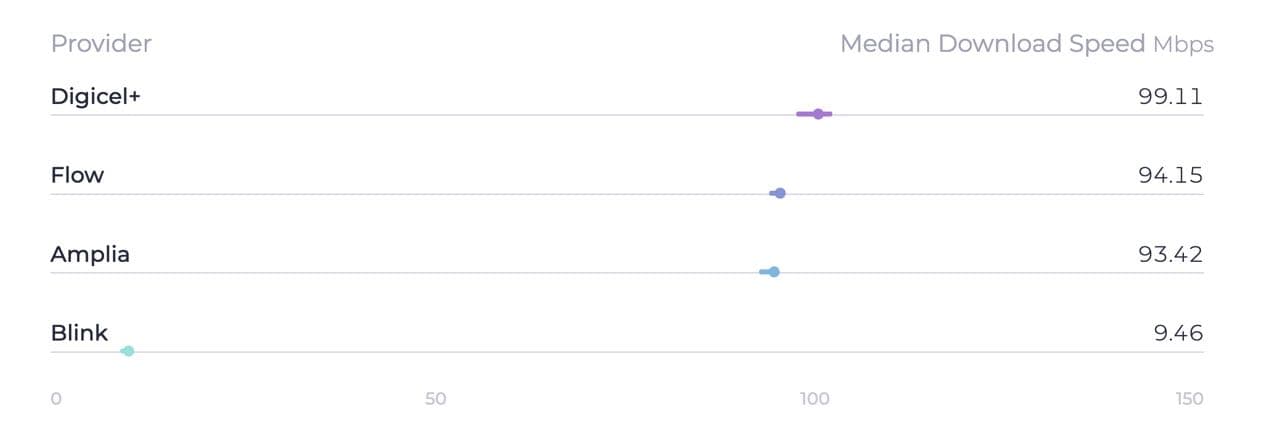 Flow registers a significantly lower upload speed measured for fixed broadband at 24.08 Mbps compared to Amplia at 86.36 Mbps and Digicel+ at 98.32 Mbps.