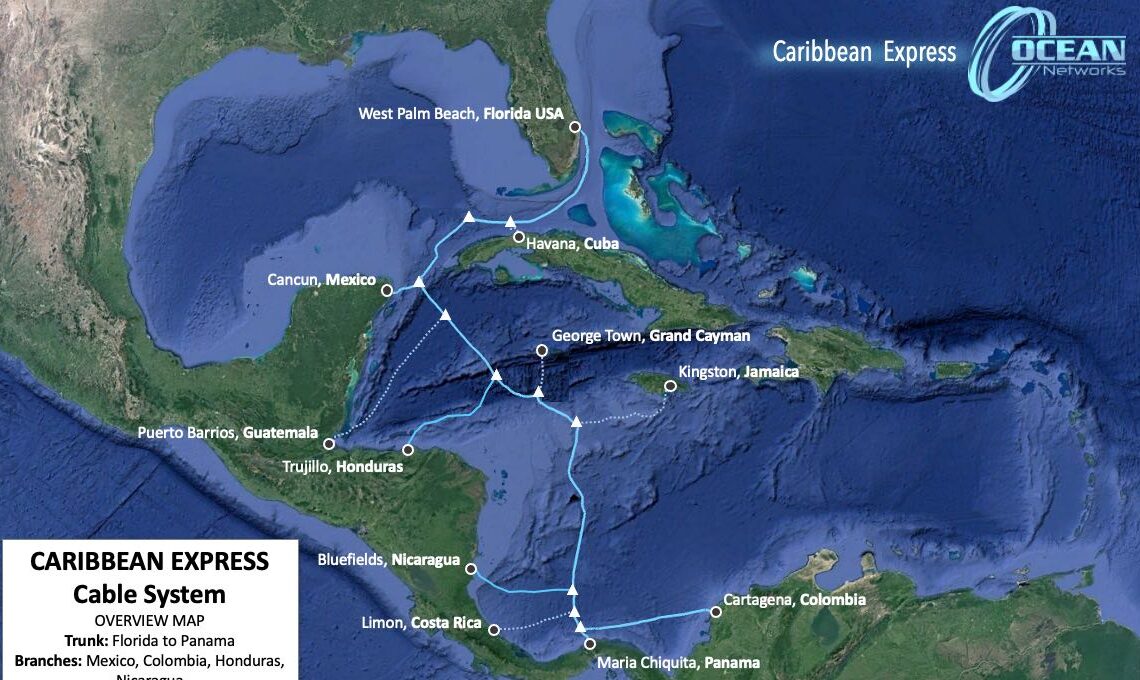 Ocean Networks (ONI) announced in mid-February that it has launched its Caribbean Express (CX) Project, an 18-fiber pair submarine cable system linking Florida to Panama. The CX system will utilize Space Division Multiplexing (SDM) technology to connect West Palm Beach (Florida), Balboa (Panama), Cancun (Mexico) and Cartagena (Colombia) with high speed, low latency fiber-optic connectivity. In addition, the system will be designed for future connectivity to other countries along the route.