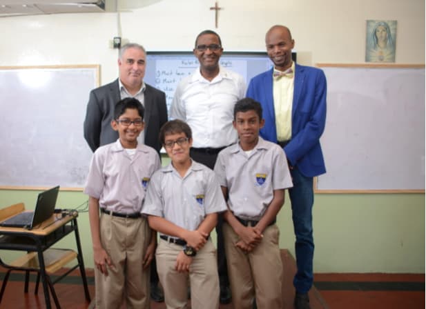 Above (left to right, back row): David D’Oliveira, vice president Columbus Busienss Solutions, Fr. Gregory Augustine principal of Fatima and Dwight Andrews, President of the Fatima Old Boys Association with students at the school.