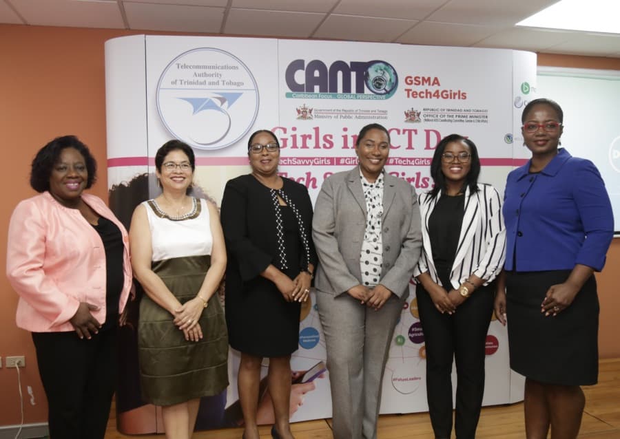 Above (L-R): Sherry McMillan, Executive officer Corporate Communications at TATT, is joined by the Deputy Chairman of the organisation, Dr. Kim Mallalieu, Teresa Wankin – Secretary General at CANTO, Marsha Caballero – Senior Manager Corporate Communications at TSTT, Jayme Hoyte – Executive Director, SmartTerm Ltd and Yolande Agard-Simmons – Communications Manager Trinidad and Tobago & Curacao, C&W at the Girls in ICT event which took place on April 25 at TATT’s Headquarters. Photo courtesy TSTT.
