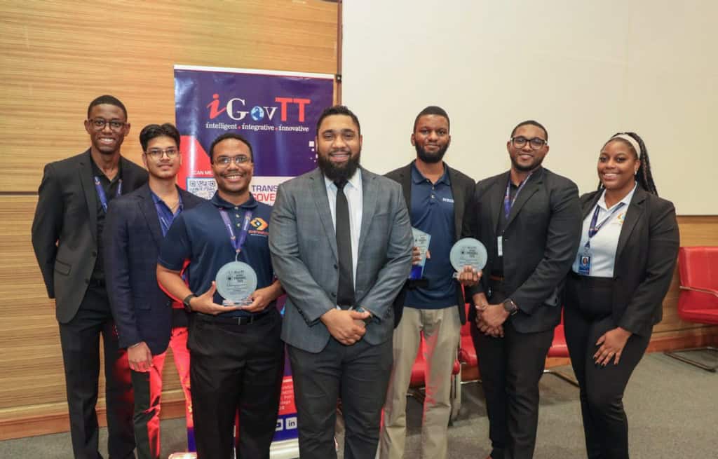 Above: Nigel Newallo-Singh, Ag Head of Security Operations and Assurance at iGovTT (centre), congratulates the winners of the technical challenges. Keronn Gill, winner of the OSINT Challenge and Overall CyberDrill Winner, and Reynold Ezra Cooper, winner of the Capture the Adversary Challenge, proudly display their awards. Photo courtesy iGovTT.
