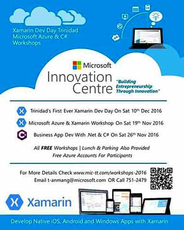 Microsoft West Indies invites you to a host of FREE, unique, hands-on developer workshops in Nov and December which covers developing business apps with C#, native cross platform mobile apps for Android, Windows and iOS using Xamarin, developing on the Unity Game Dev and VR engine and also explores developing on the robust Microsoft Azure Cloud platform which supports over 300,000 active Azure websites, over 1,000,000 Azure SQL Databases and more than 1.65 million developers registered with Visual Studio Online.