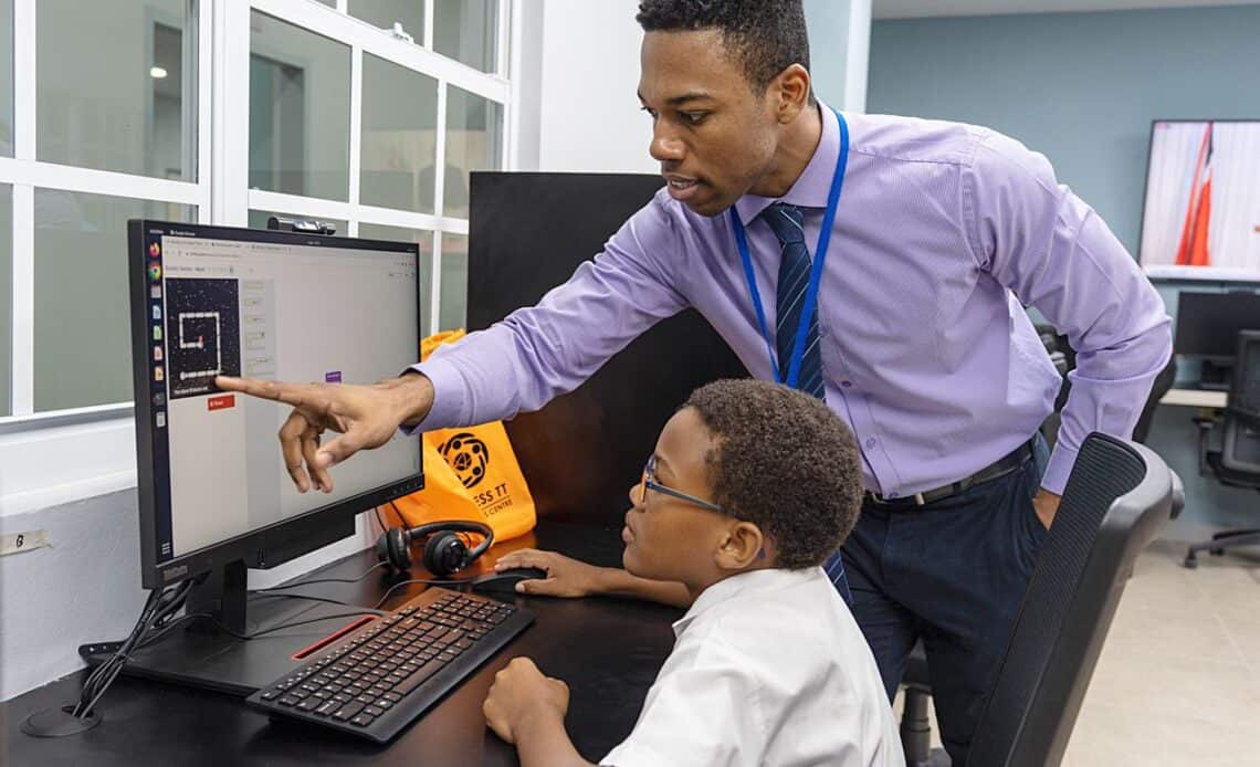 Above: Isaiah Colthrust of the Ministry of Digital Transformation with a young student at the Diego Martin ICT Access Centre. Photo courtesy MODT.