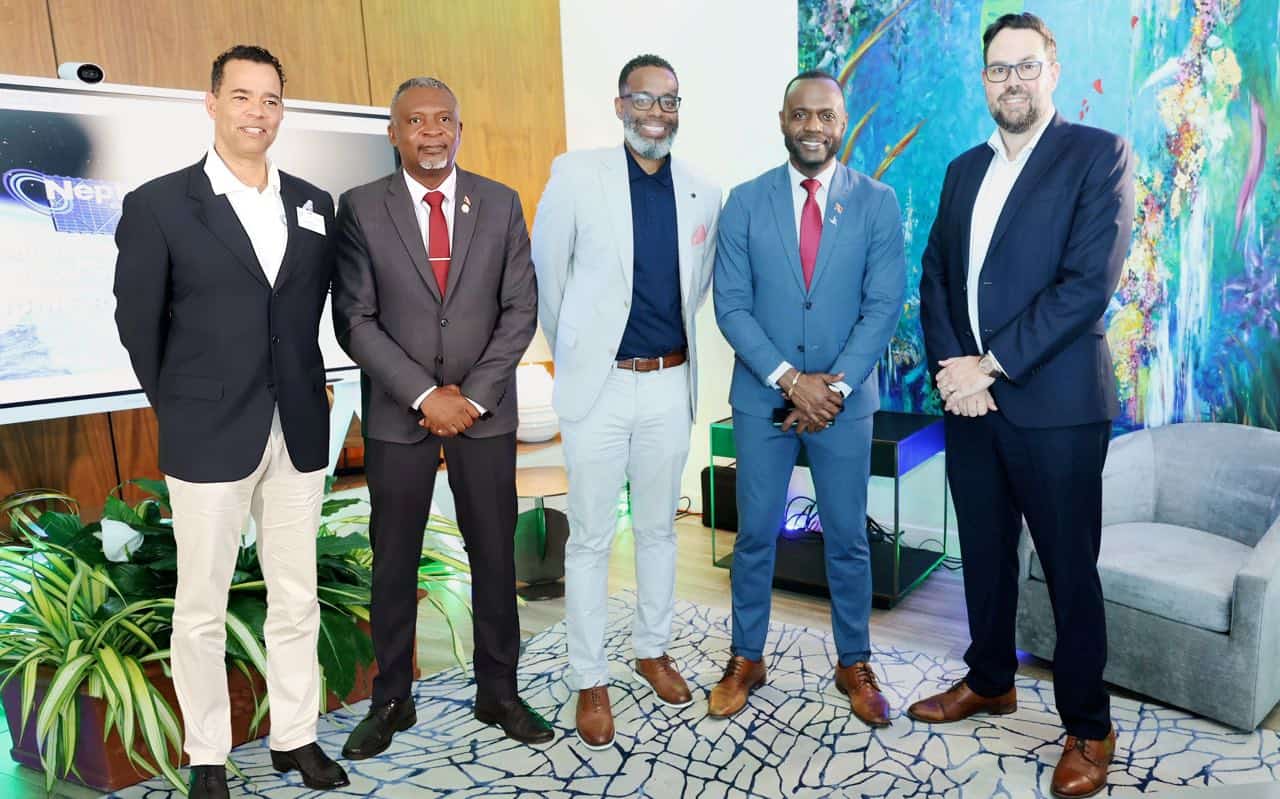 Julian Jordan (left to right), CEO of Neptune Communications, Senator the Honourable Hassel Bacchus – Minister of Digital Transformation, Darryl Duke – Assistant Vice President of Business Sales at TSTT, The Honourable Marvin Gonzales – Minister of Public Utilities and Kent Western – CEO of TSTT.