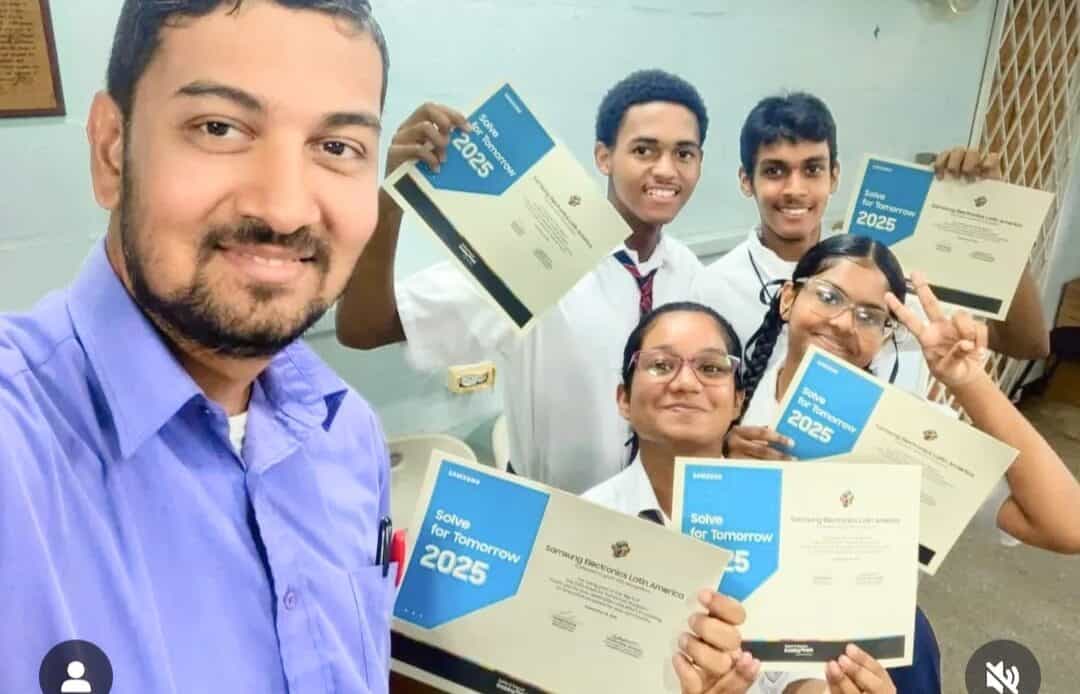 With this proposal, they participated in the 12th regional edition of the Solve for Tomorrow (SFT) 2025 educational programme, which was launched by Samsung Latin America earlier this year. After competing against approximately 3,000 project ideas and advancing through multiple qualifying rounds, the team — comprising students Anjello Webb, Jesse Lee Sirju, Maahir Ramlakhan, and Priya Bachan, along with their teacher Sunil Bridglal — is now among the five finalist groups.