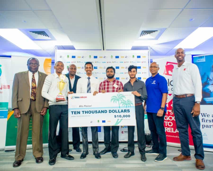 Above: Team ‘Bits Please’ pose with their prize flanked by Sponsor representatives: Barton Clark- Executive Director-CARDI; Learie Roberts- Marketing Manager- Massy Technologies InfoCom; Kevin Khelawan COO- Teleios Systems; Juma Bannister- Relate Studios. Photo by Relate Studios, courtesy Teleios.