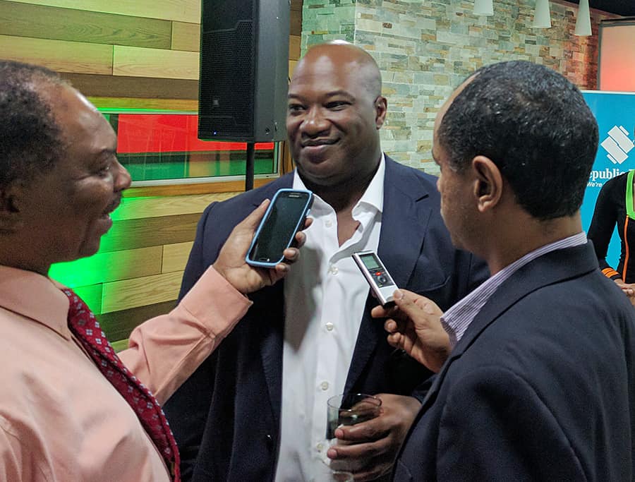Above: TSTT CEO Dr Ronald Walcott speaks to the media at the launch of the BMobile Visa Card. Photo courtesy Shiva Bissessar.