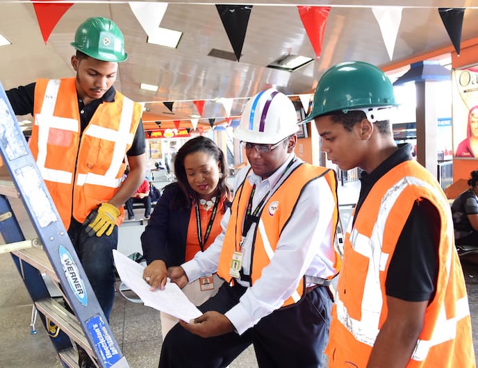 Above:ย TSTT’s Lorraine Jones (second from left) and engineer Gabriel John collaborate with technicians onsite at the installation of the free WiFi at City Gate. Photo courtesy TSTT.